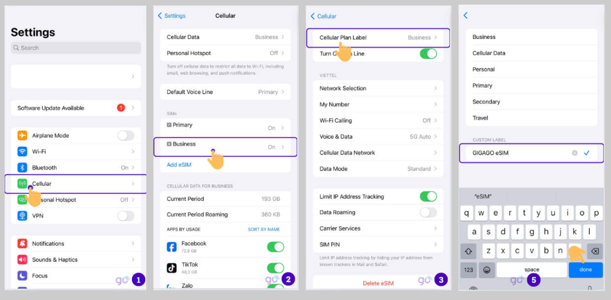 Các bước đặt tên eSIM trên iPhone.
