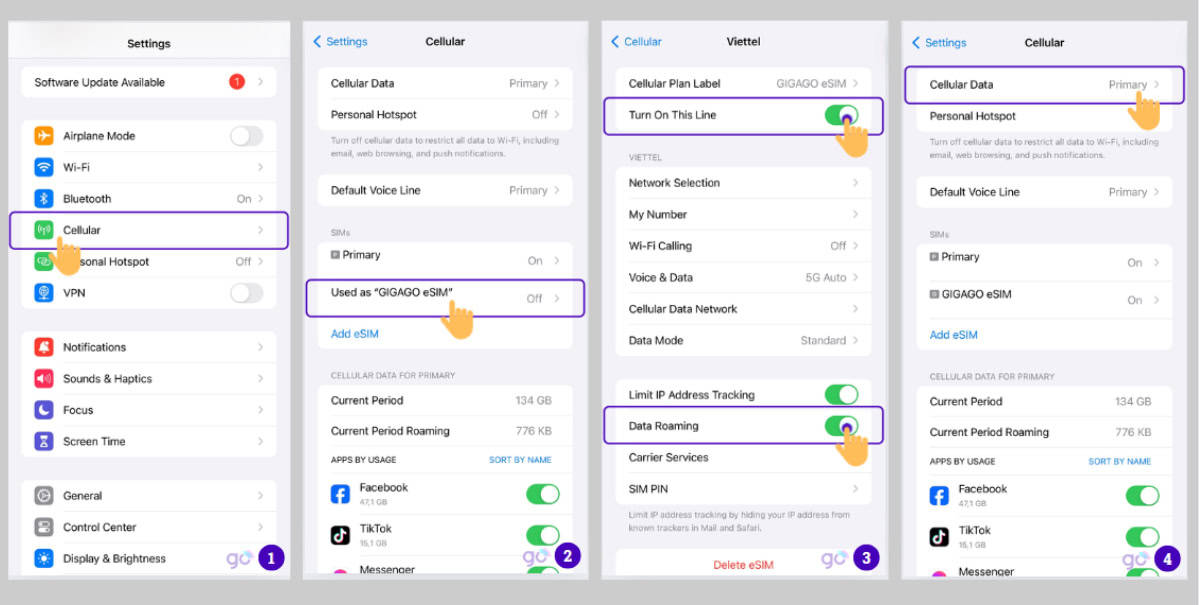 • Vào Cài đặt (Settings) > Di động (Cellular / Mobile) > Chọn eSIM du lịch > Chọn Bật dòng này (Turn on this line)