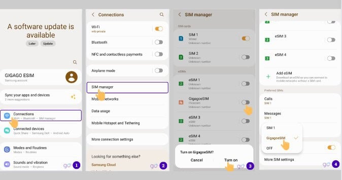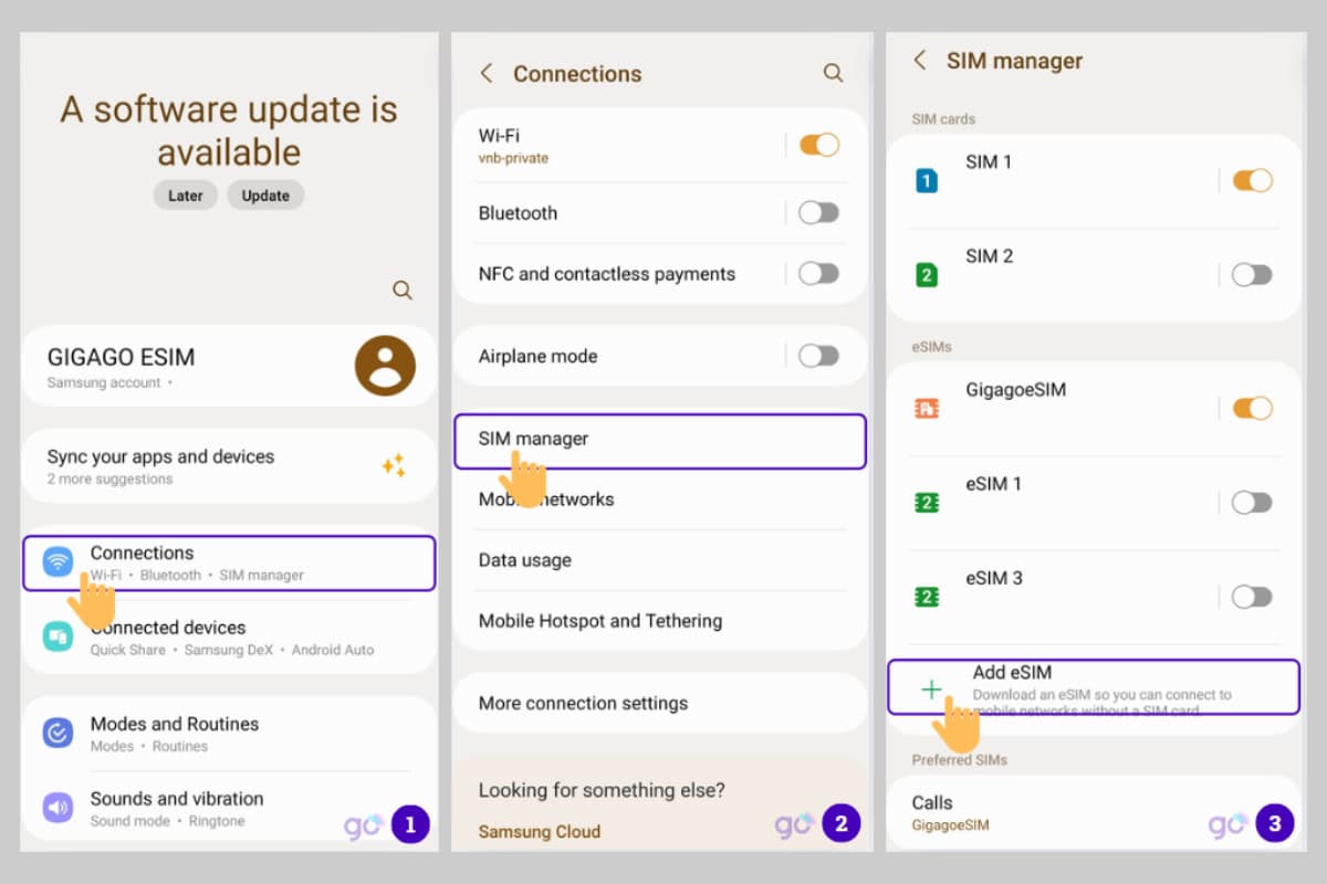 Các bước cài đặt eSIM trên Samsung – bước 1, 2, 3